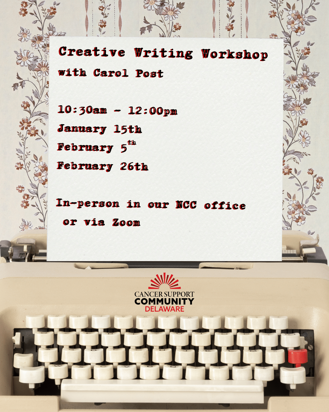 Join us for a three-session Creative Writing Workshop led by Carol Post. Writing comes easily to some, while others find it more challenging. In this workshop, participants will discover ways to approach writing with enthusiasm and learn to enjoy the creative process along the way. Over the course of the series, Carol will guide you from a simple list of thoughts to a meaningful story through constructive feedback, drafting, and editing.
