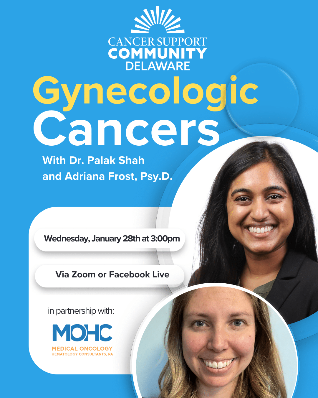 Join us via Zoom for this presentation which will provide an overview of gynecologic cancers, explain treatment options, help you prepare for office visits, discuss second opinions and clinical trials, explore the impact on caregivers, and address the emotional challenges of a gynecologic cancer diagnosis. Presented in partnership with Medical Oncology Hematology Consultants, PA (MOHC).